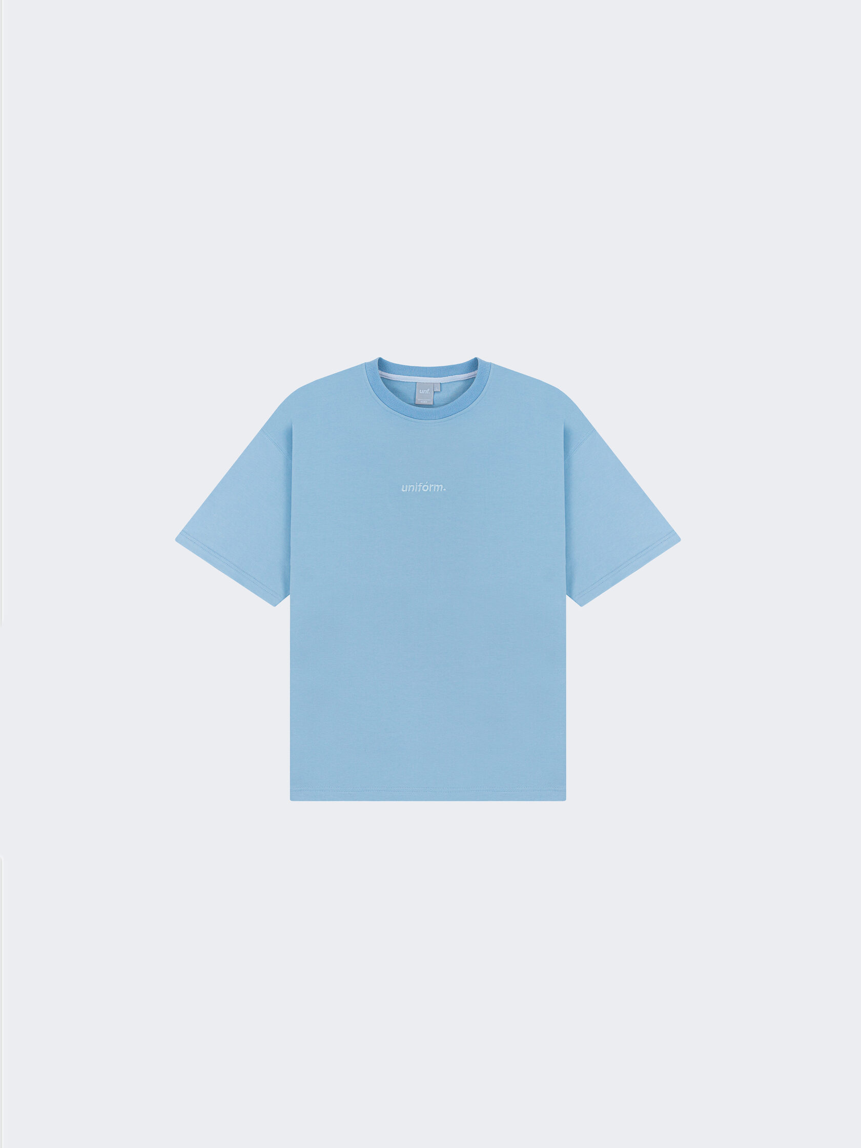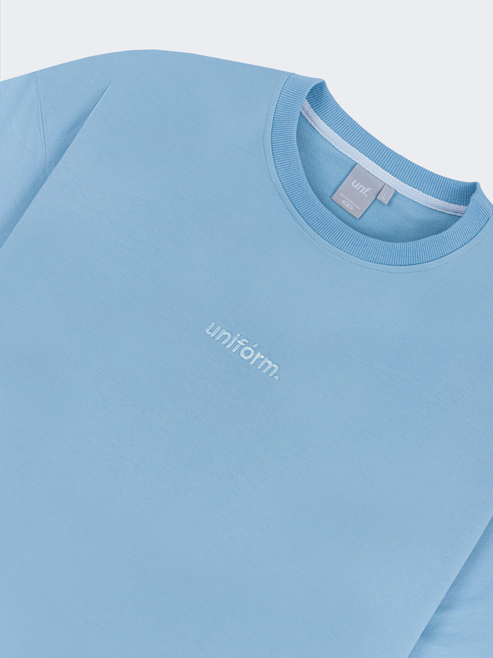 Футболка из плотного футера голубого цвета с лаконичной вышивкой на груди изделия.