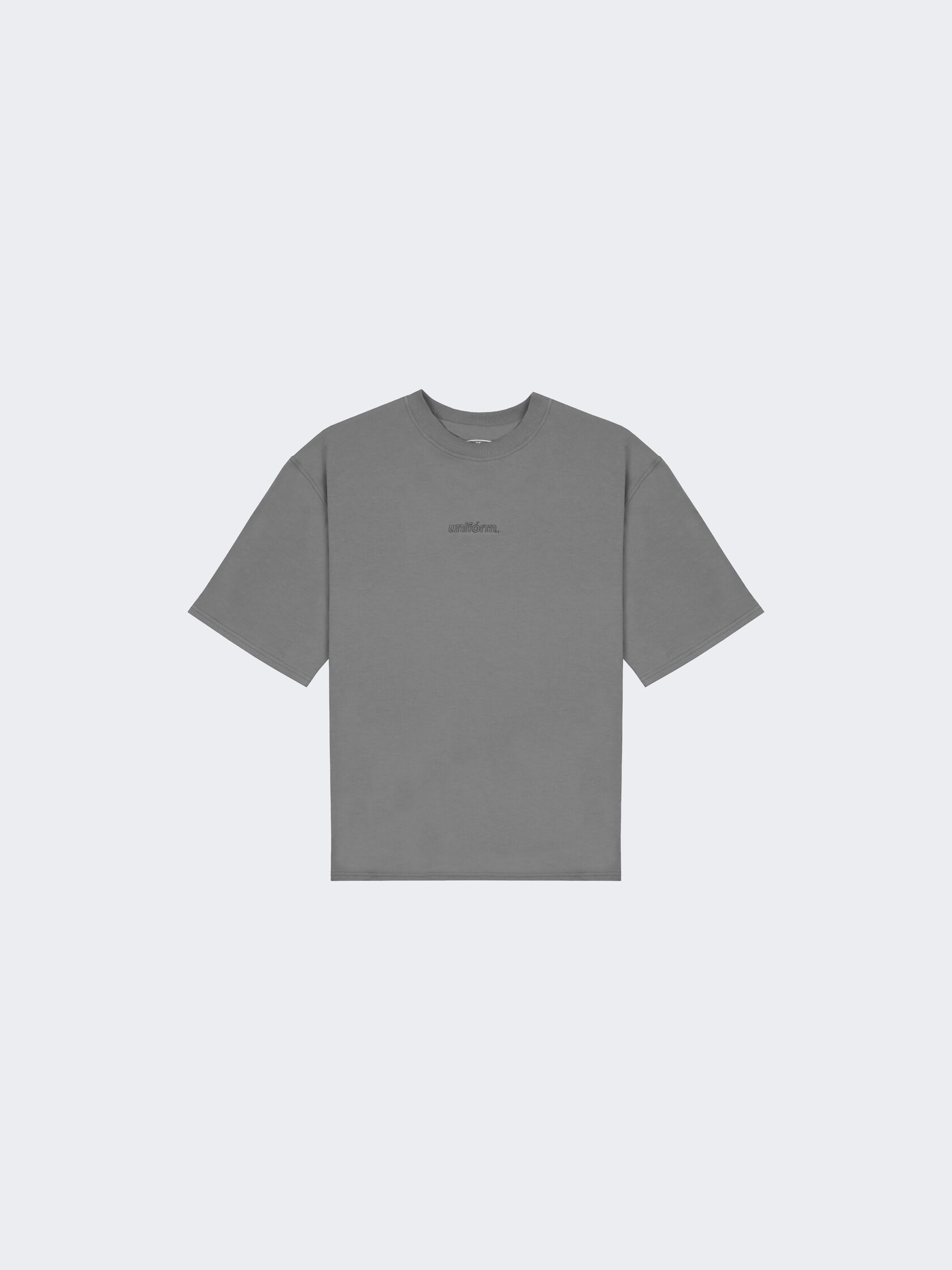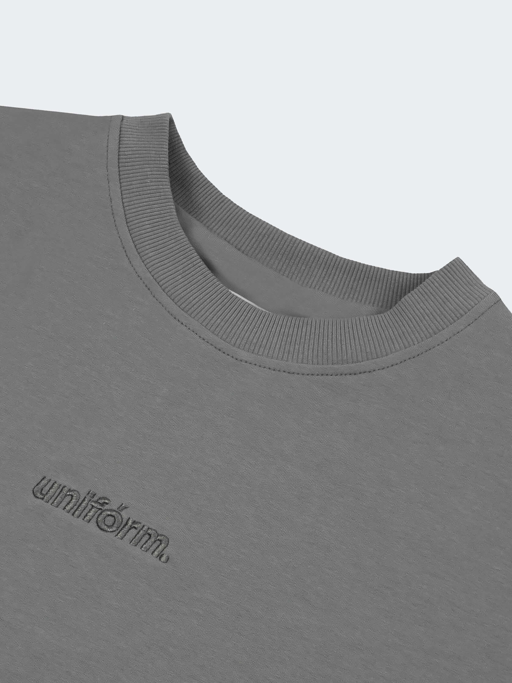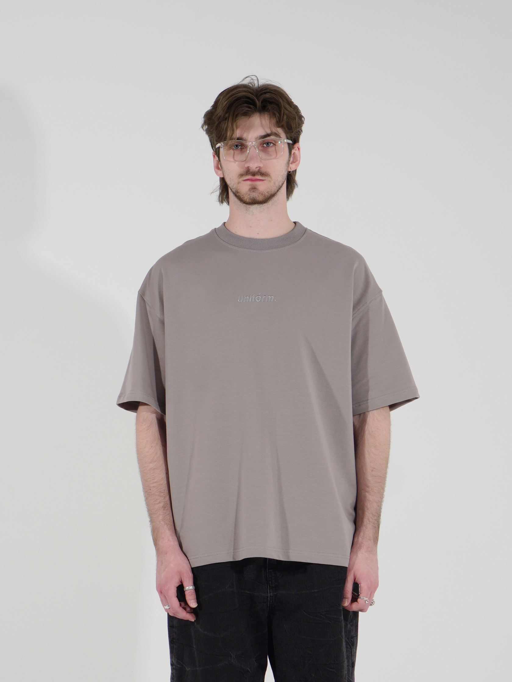 Футболка из плотного футера теплого серого цвета с лаконичной вышивкой на груди изделия