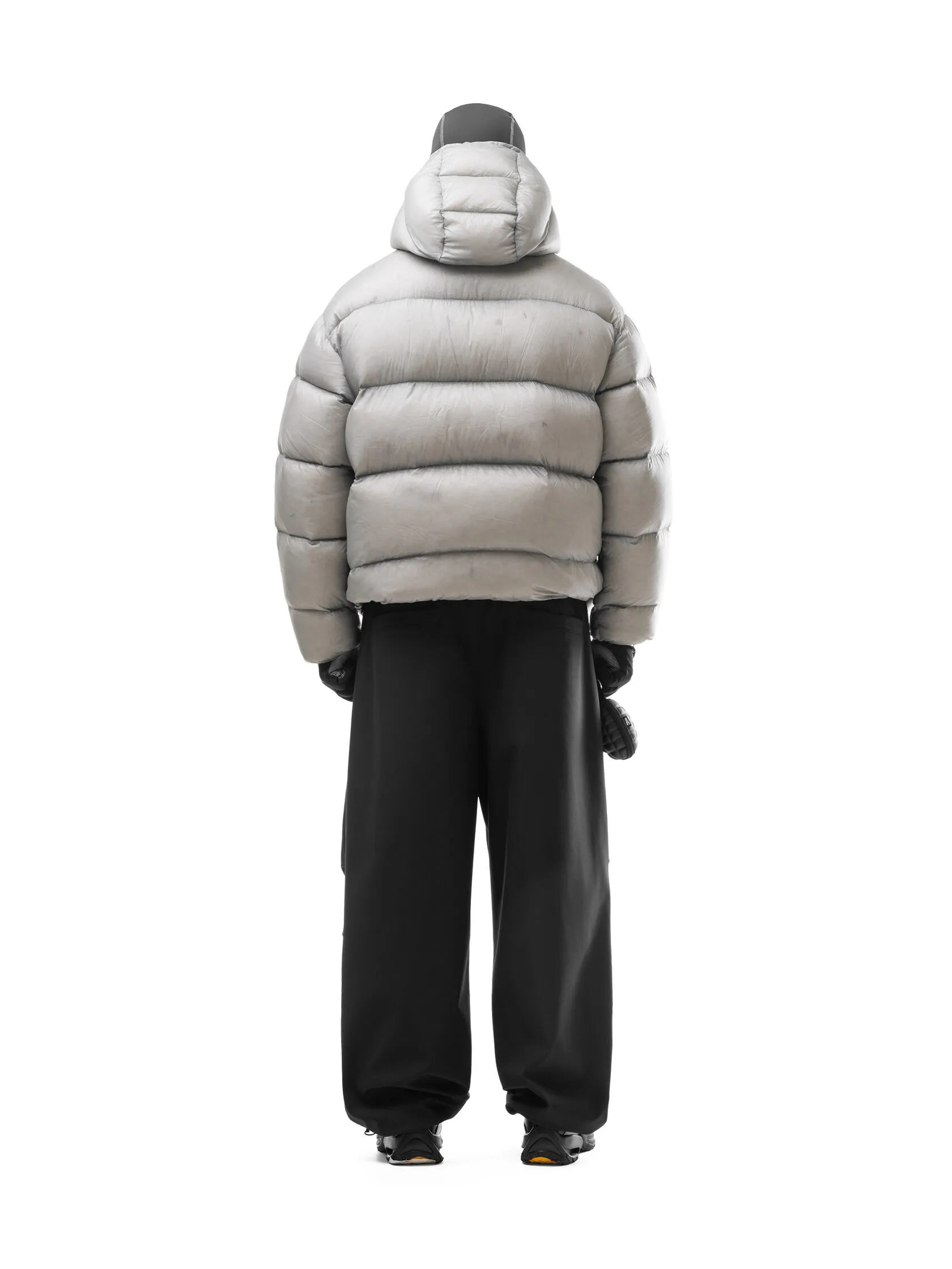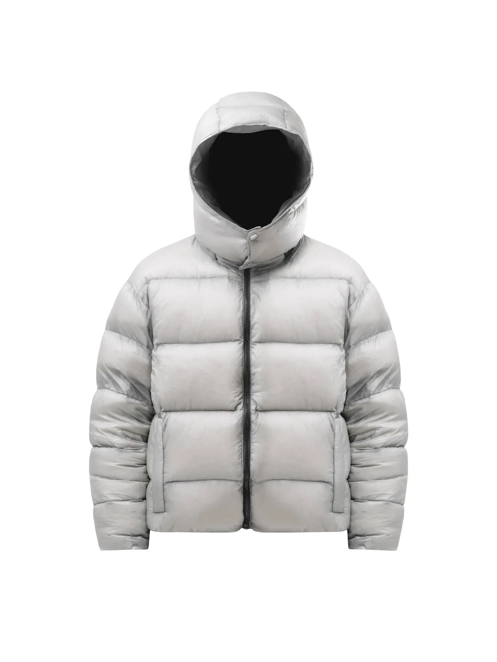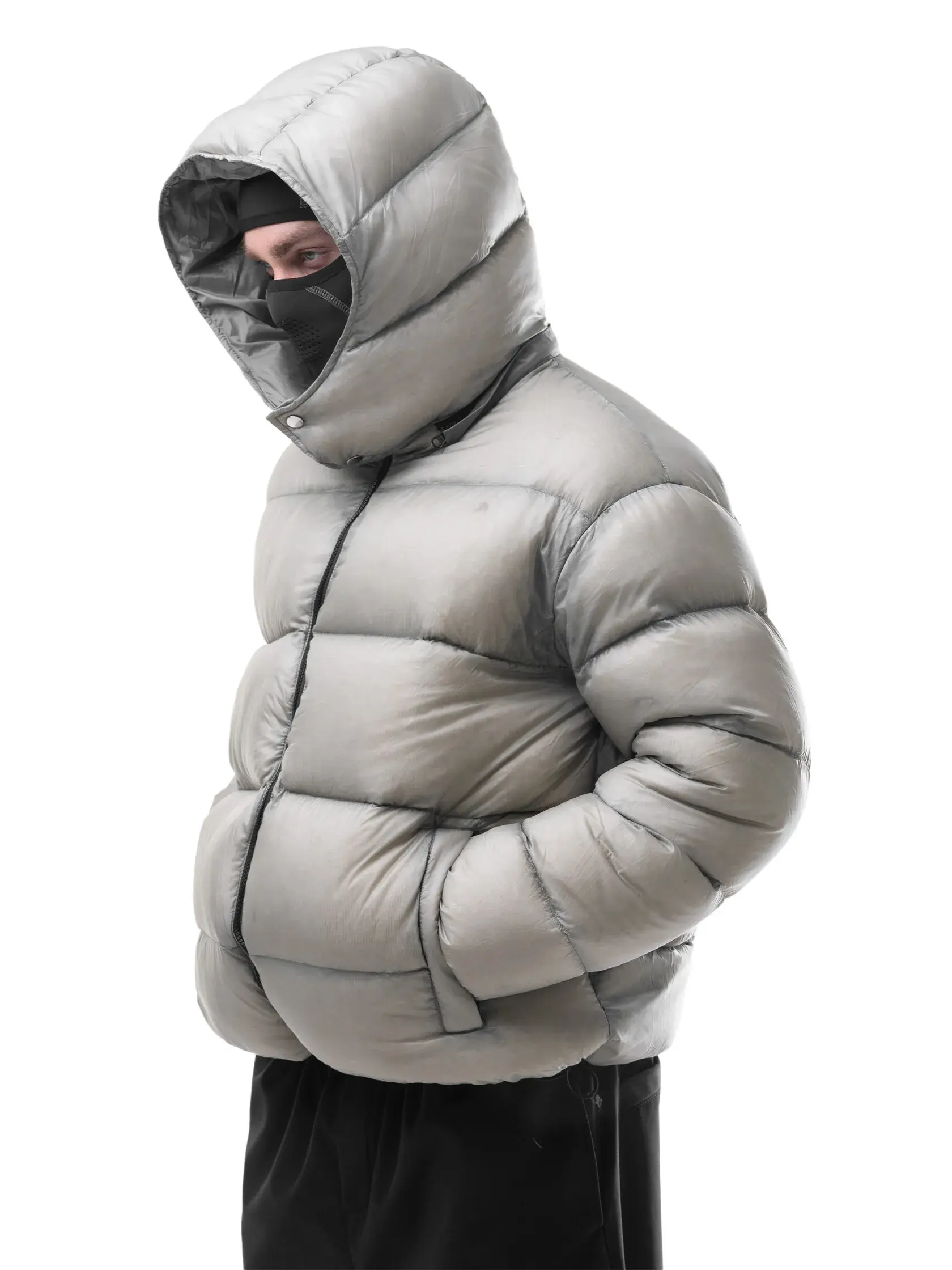 Пуховик из полупрозрачной нейлоновой ткани с рипстоп плетением, устойчивого к разрывам и истиранию. Натуральный пух обеспечивает лёгкость и высокую теплоизоляцию даже в условиях сильного холода. Температурный режим до -35°C. Объёмный крой и широкие простёжки равномерно распределяют утеплитель, исключая появление холодных зон.