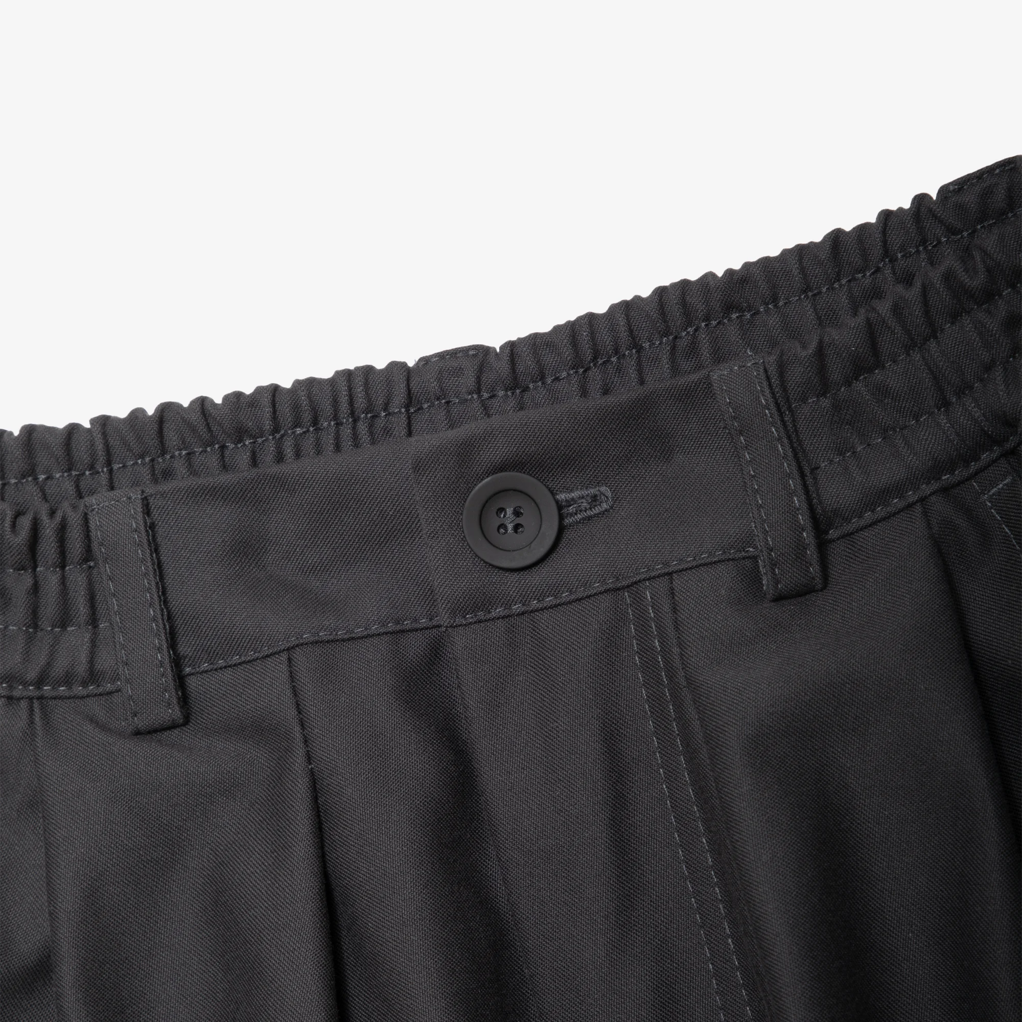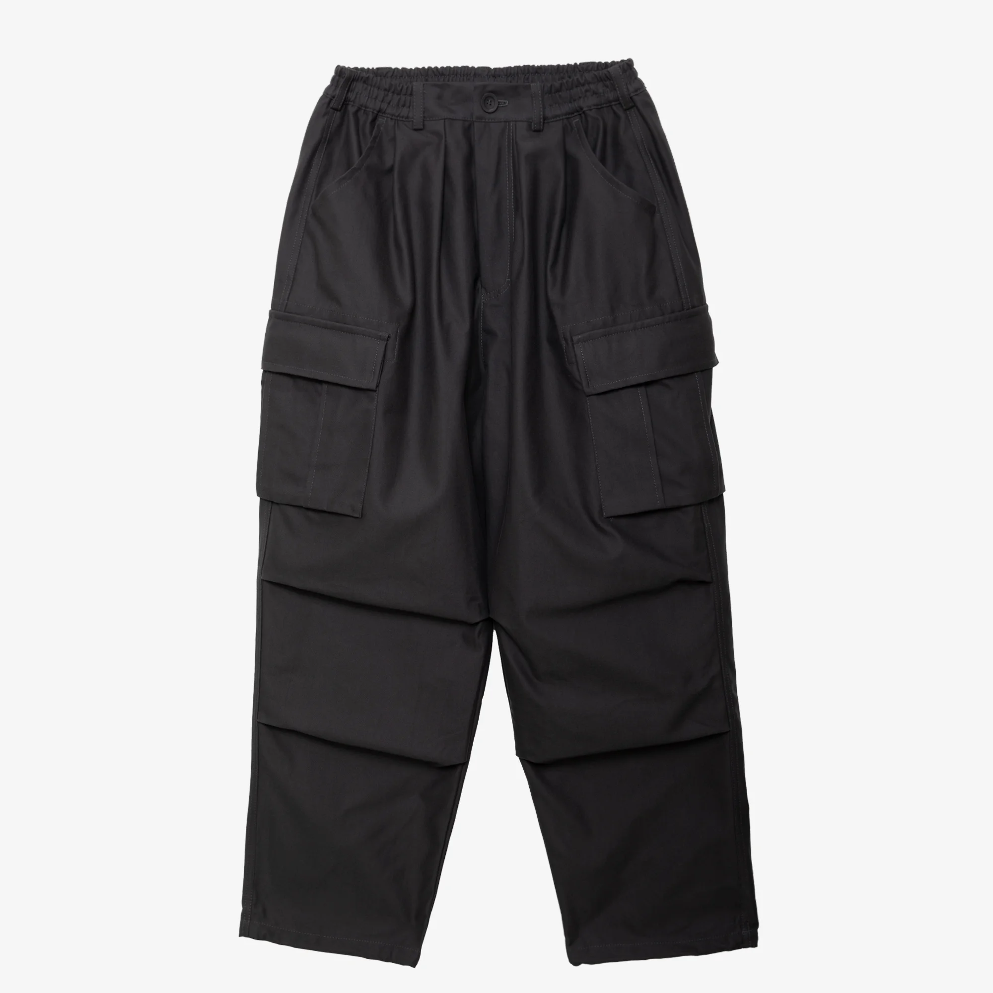 Плотная хлопковая ткань с вертикальной фактурой Широкий крой, стандартная посадка на талии, универсальная длина, унисекс Вертикальные складки спереди и горизонтальные складки в области колен для комфорта и свободы движений Эластичные резинки на линии пояса Шлевки для ремня Застежка на молнии Два врезных кармана спереди и сзади Вместительные боковые карго-карманы с клапаном, застегивающимся на пуговицу Задняя часть брюк усилена дополнительным слоем ткани Ширина основания брюк регулируется за счет пластиковых фиксаторов Патч с логотипом МЕЧ над задним правым карманом