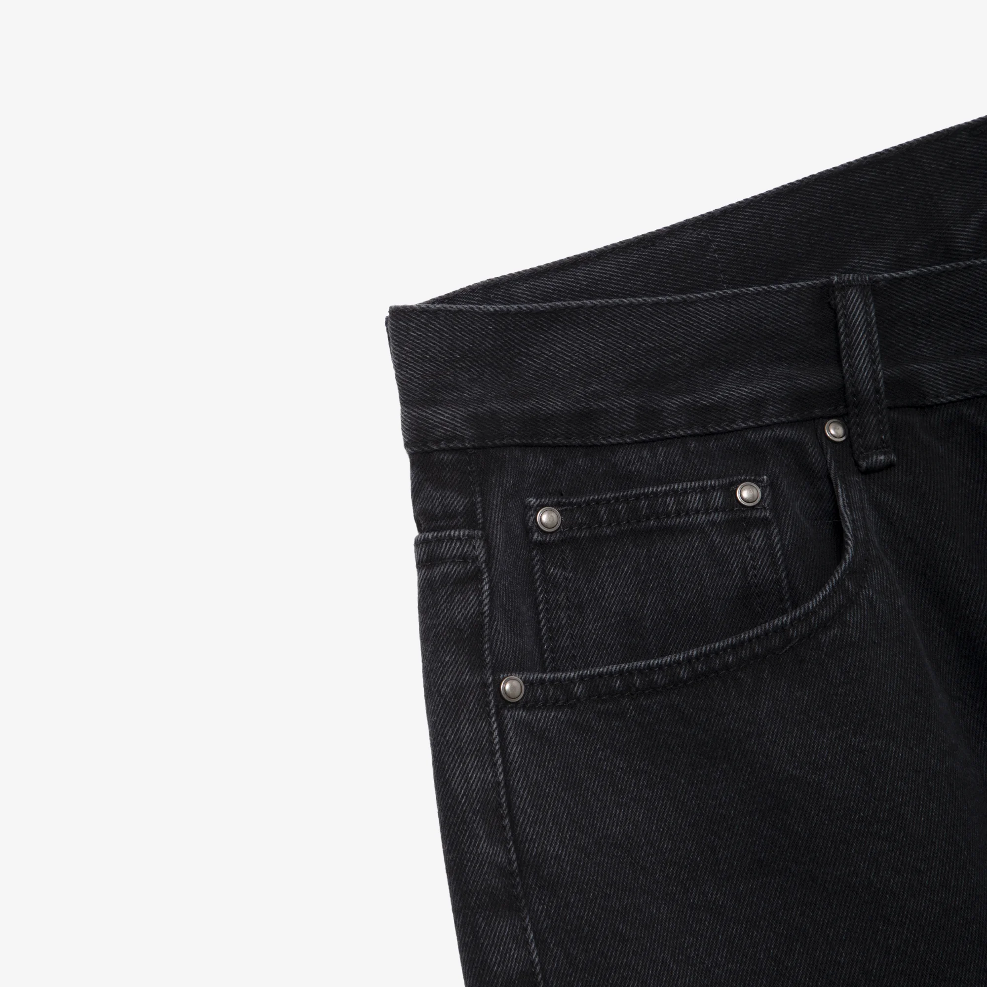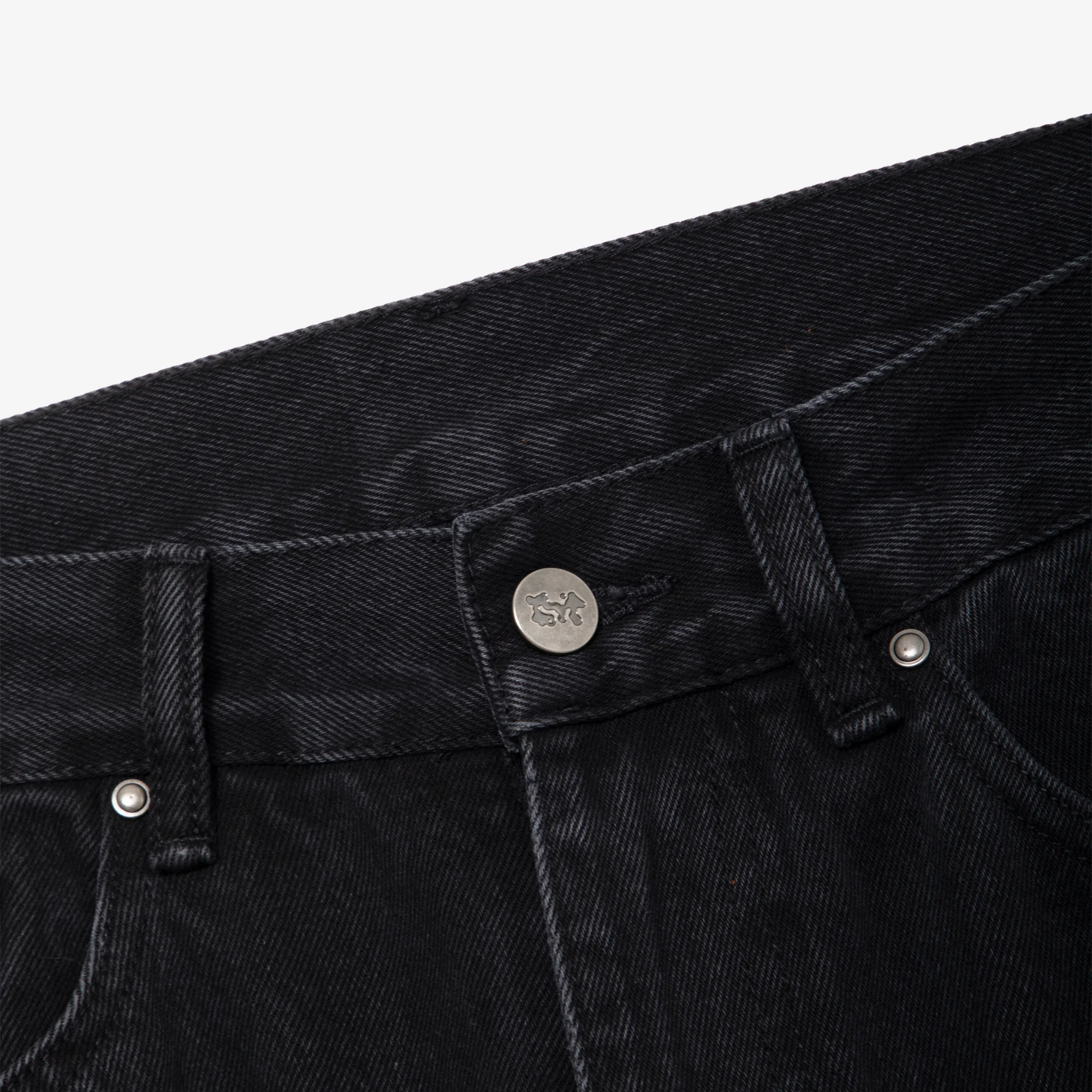 Материал: 100% хлопок Прочный деним черного цвета плотностью 13 унций Джинсы обработаны для раскрытия фактуры материала и предотвращения усадки Свободный крой со стандартной посадкой на талии Застежка на молнию Швы на карманах усилены металлическими заклепками Два кармана спереди и сзади Небольшой пятый карман Вышивка логотипа МЕЧ над задним левым карманом Кожаный патч с тиснённым логотипом МЕЧ