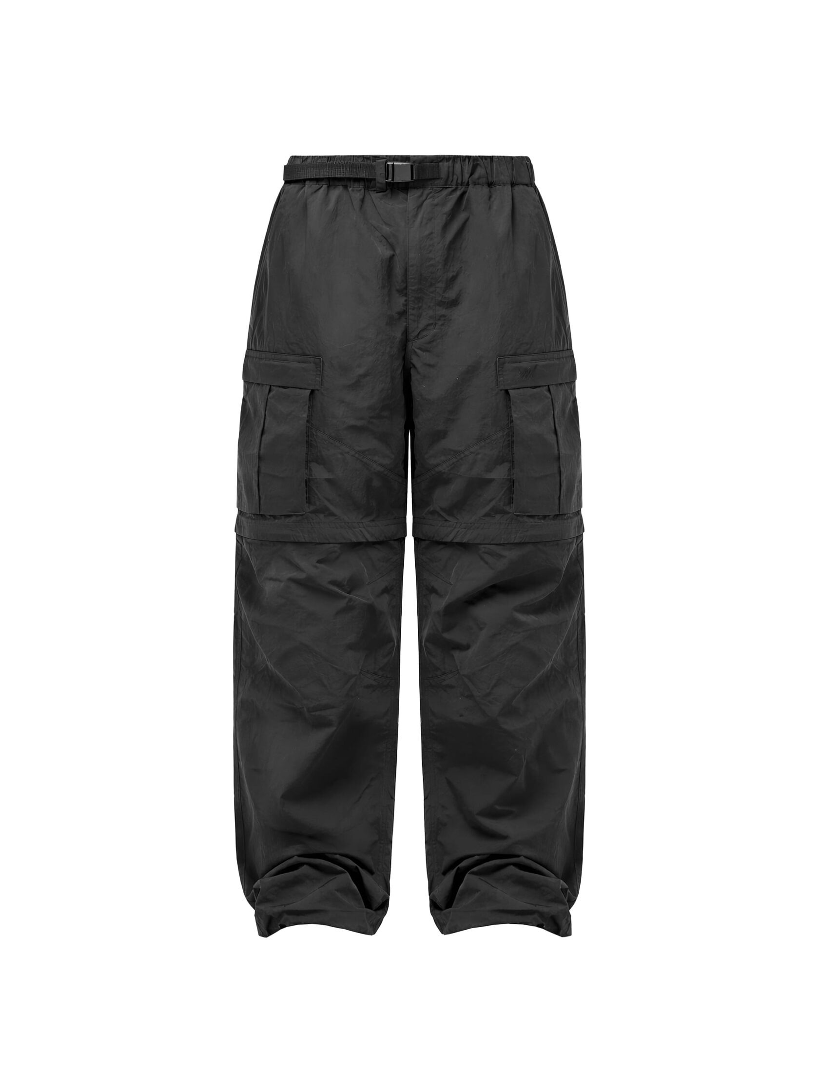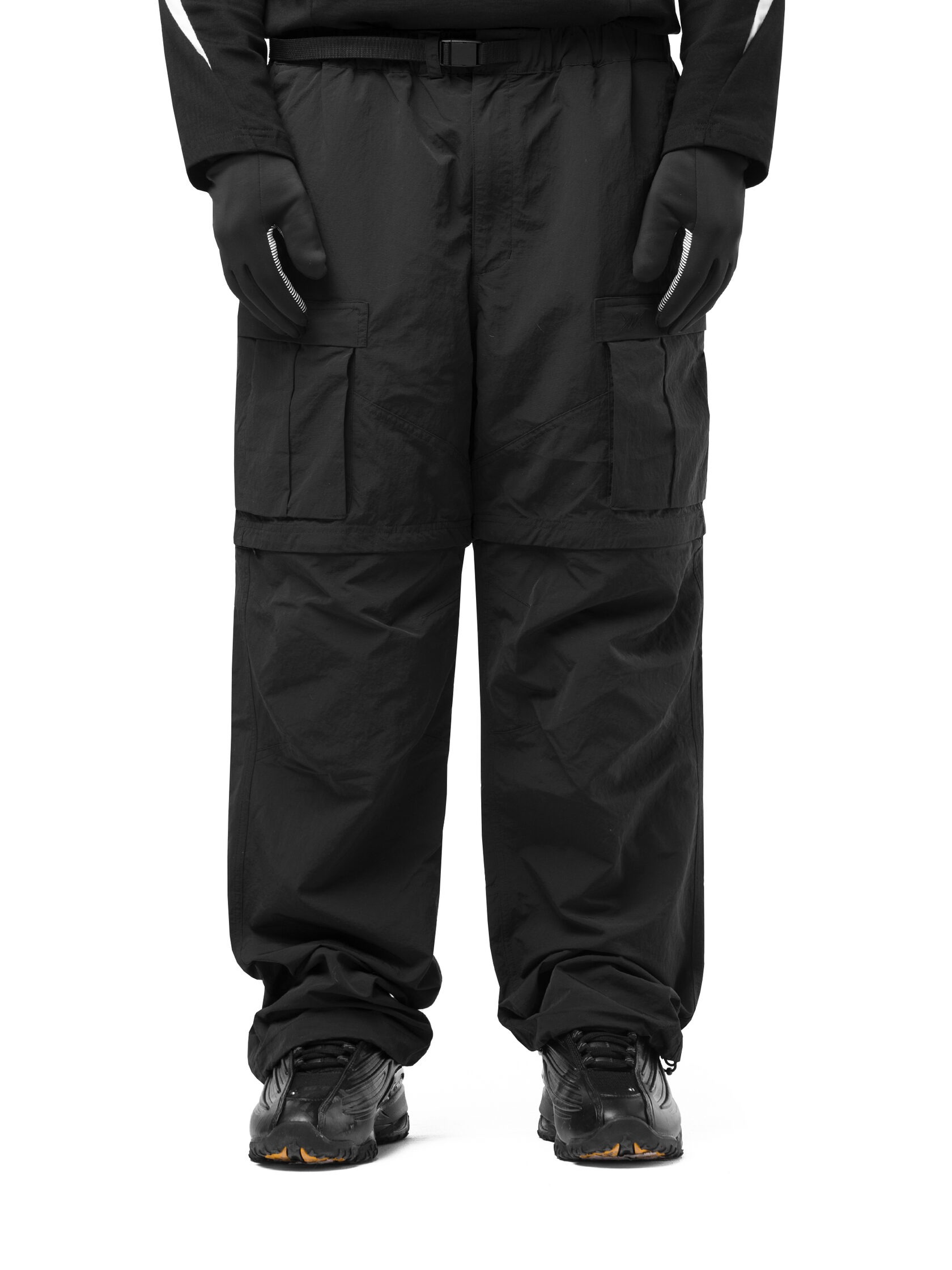 Штаны-карго свободного кроя выполнены из мембранной водонепроницаемой ткани. В нижней части штанин фиксаторы для регулировки ширины. Пояс регулируется встроенным ремнём с фастекс-застёжкой. Застёгиваются на пуговицу и молнию. Модель оснащена шестью карманами: два боковых прорезных (на молнии), два накладных кармана спереди, два кармана сзади.