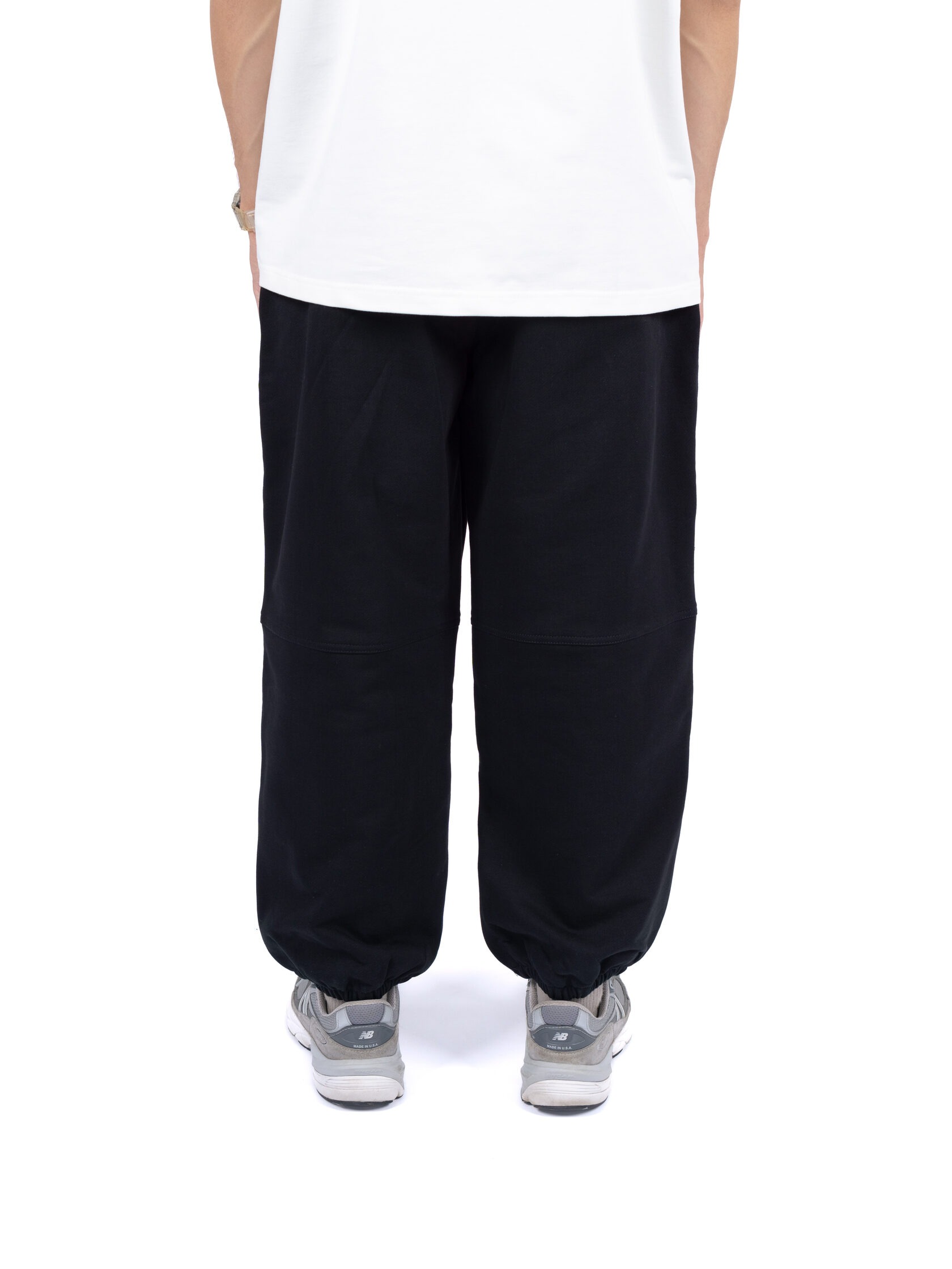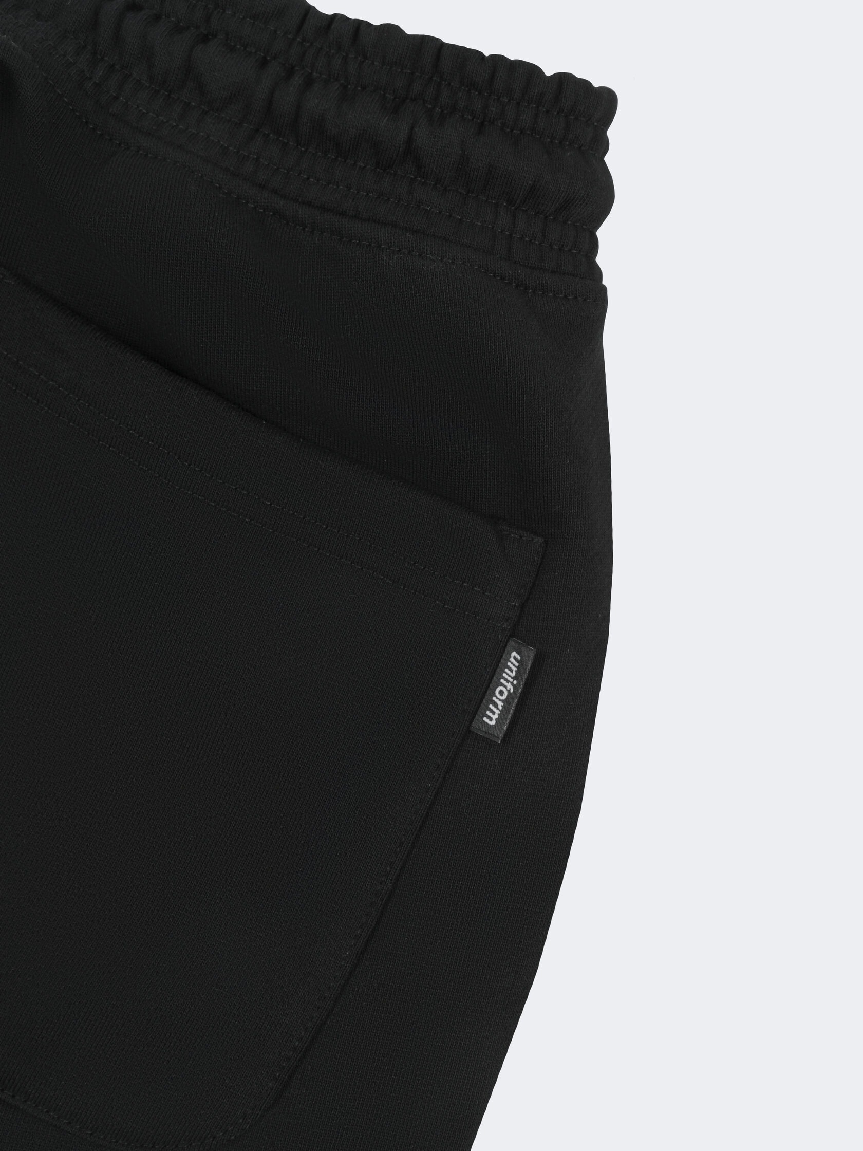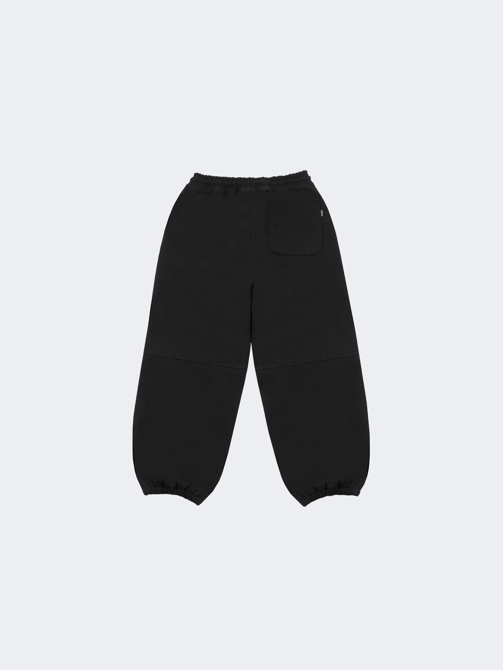 Базовые штаны широкого кроя из плотного хлопка черного цвета без начеса. Актуальны для любого времени года. Имеют регулирующий шнурок и карман на задней части изделия