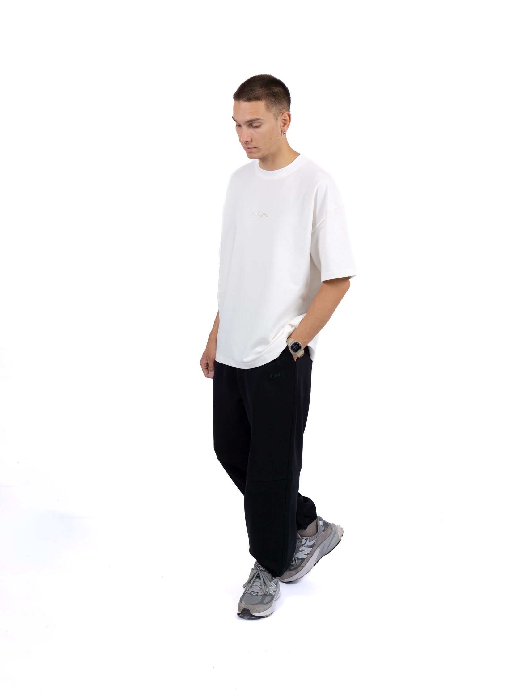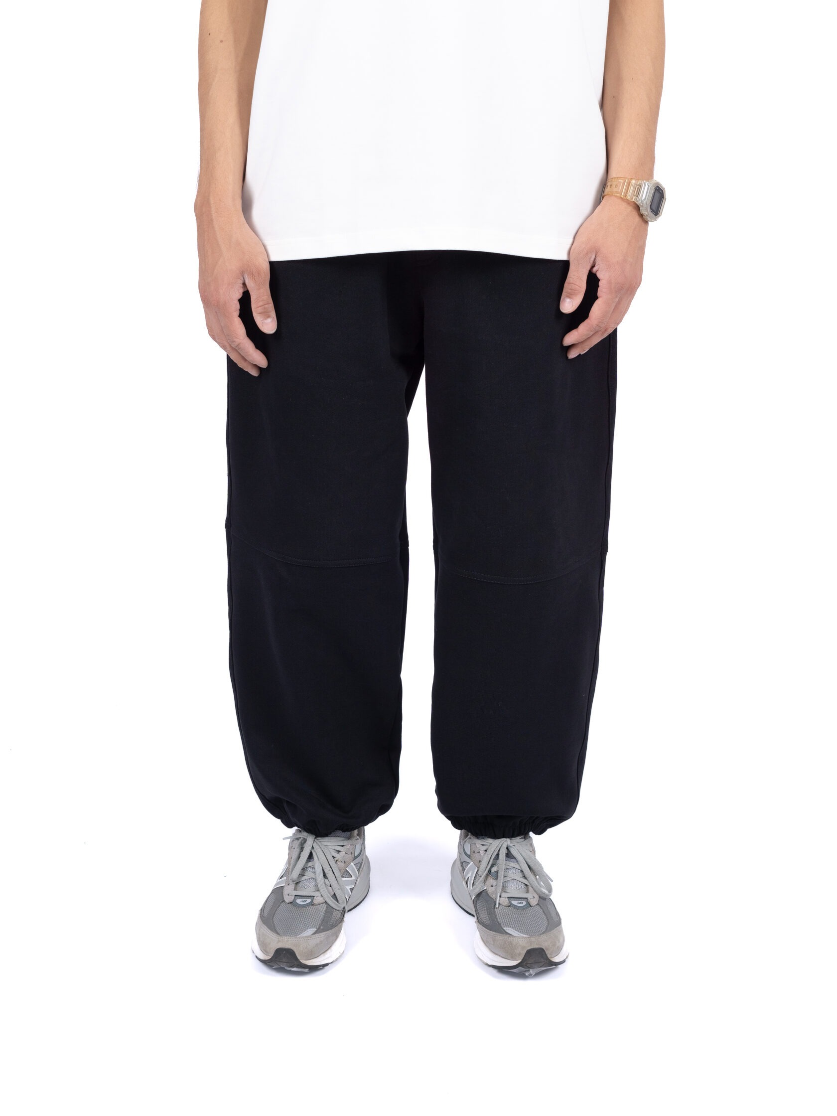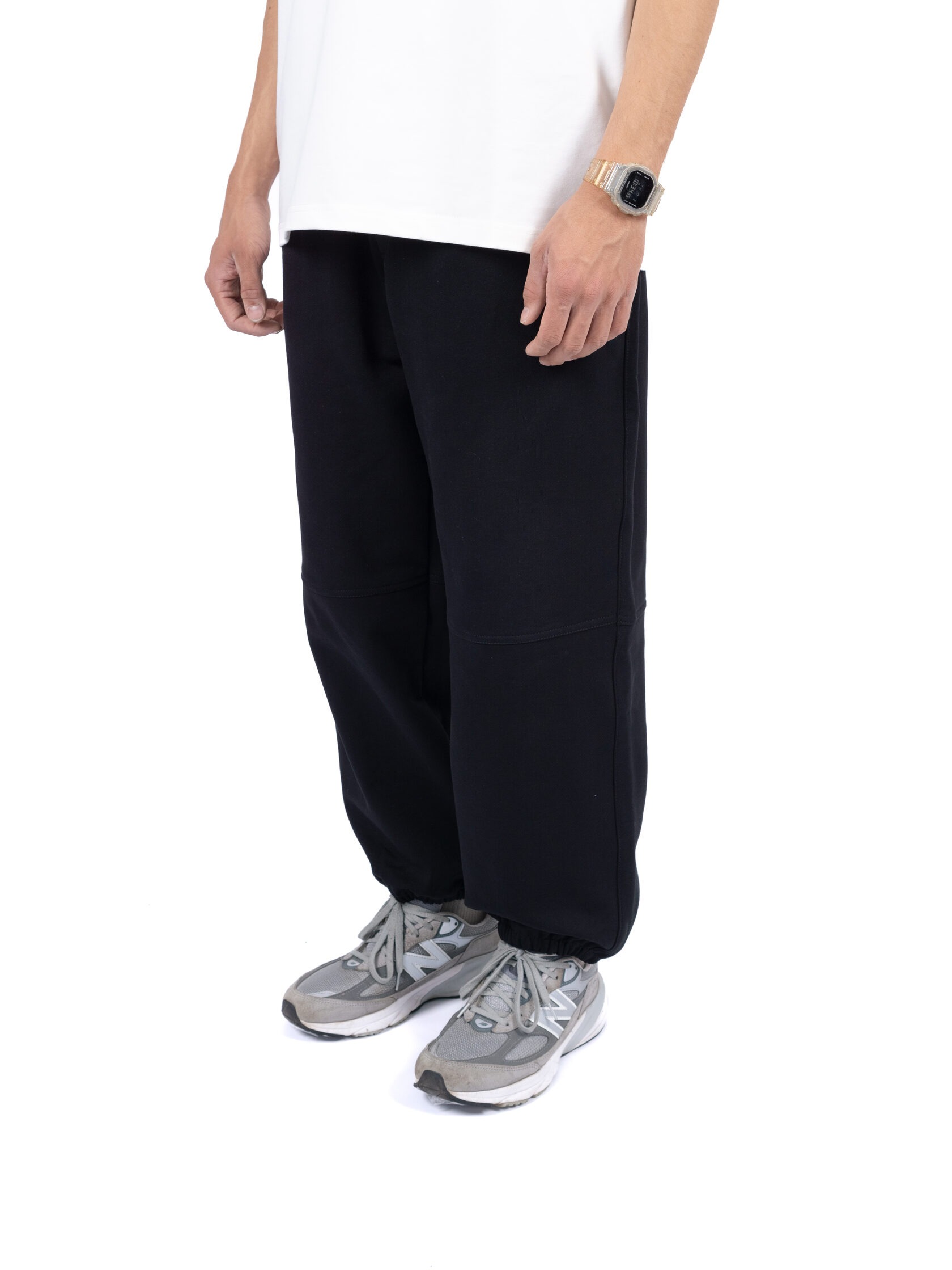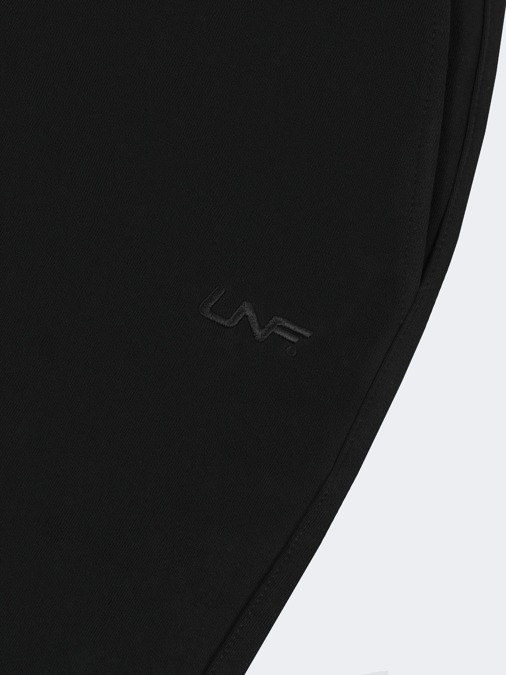 Базовые штаны широкого кроя из плотного хлопка черного цвета без начеса. Актуальны для любого времени года. Имеют регулирующий шнурок и карман на задней части изделия