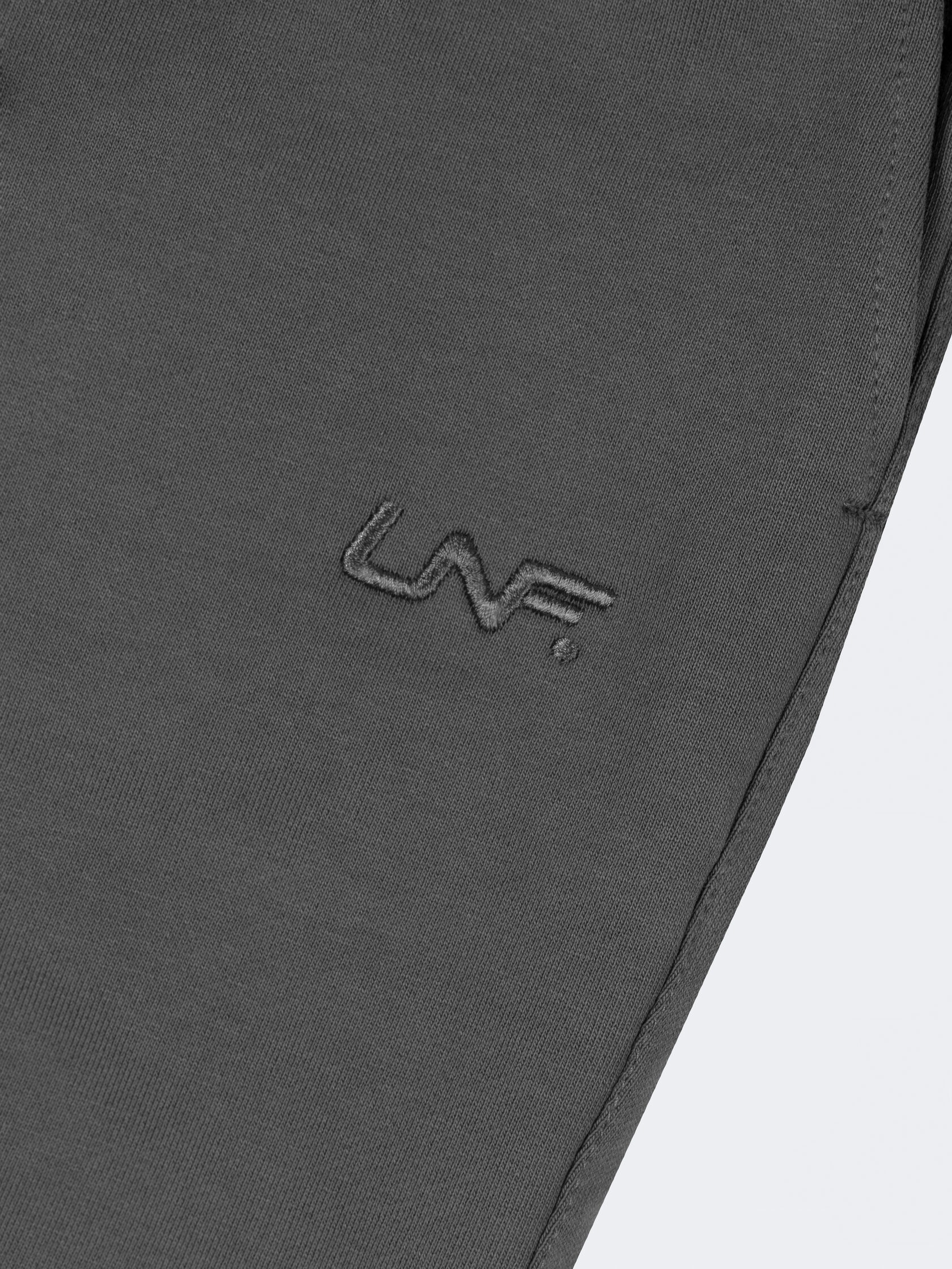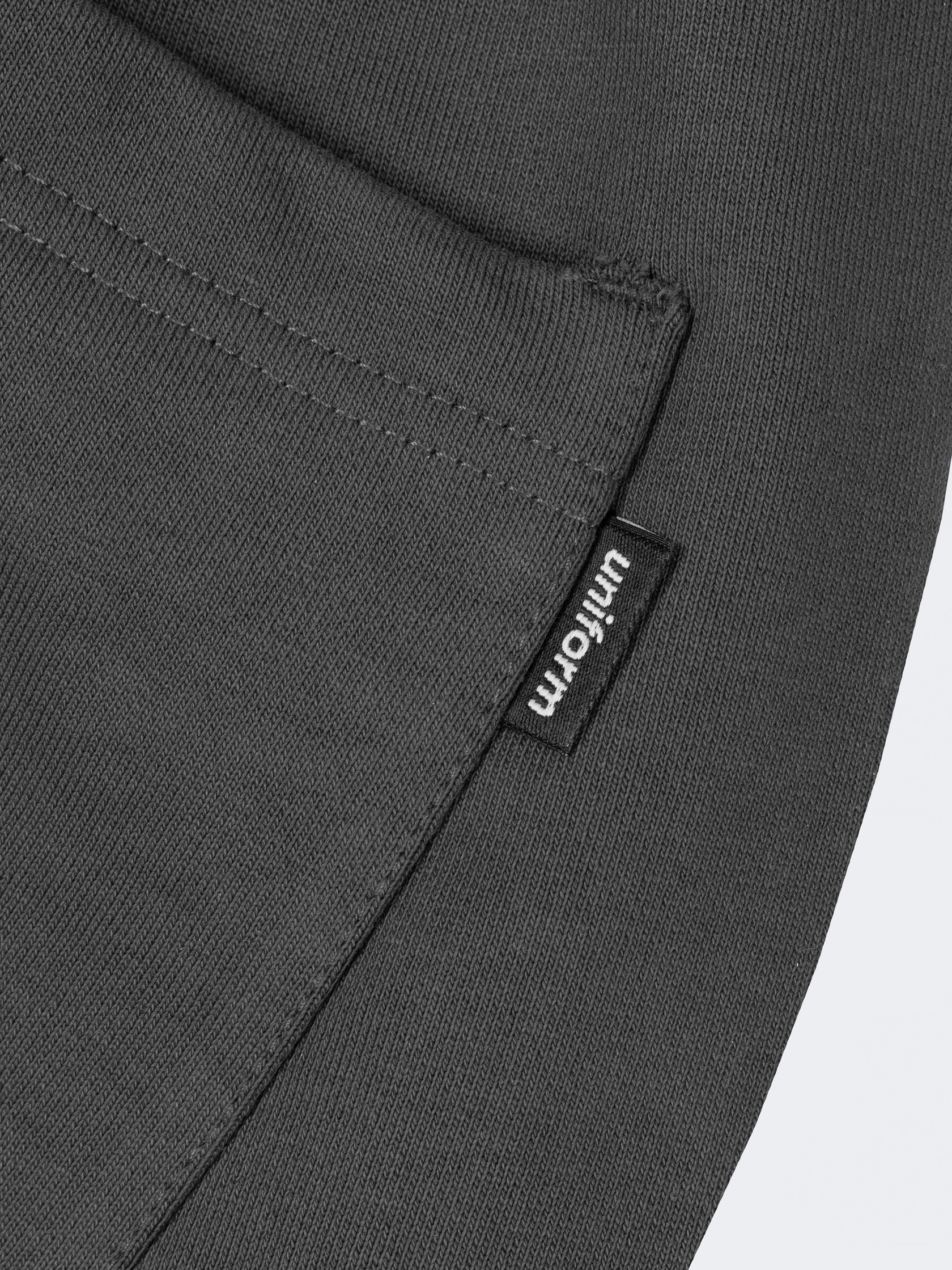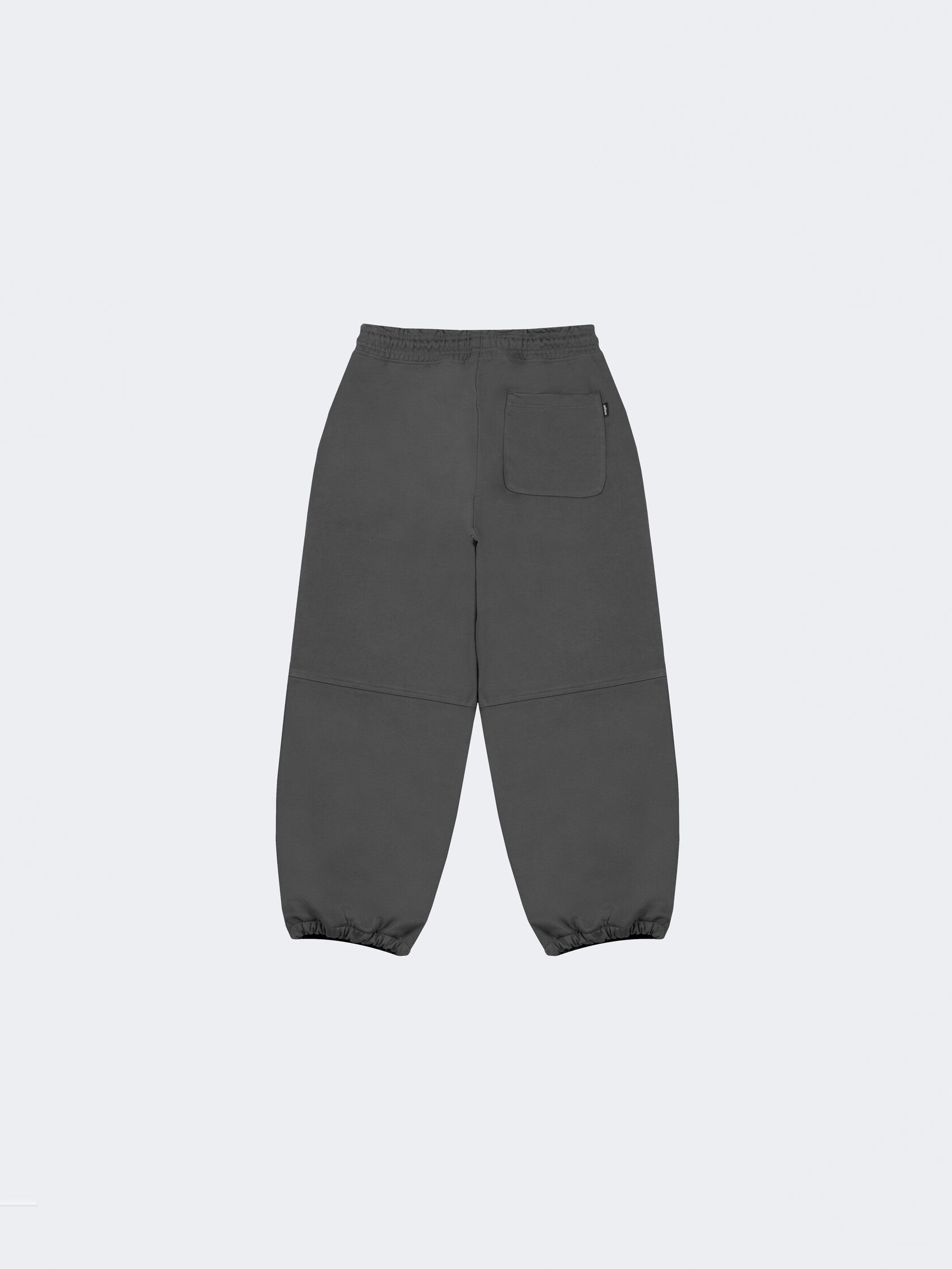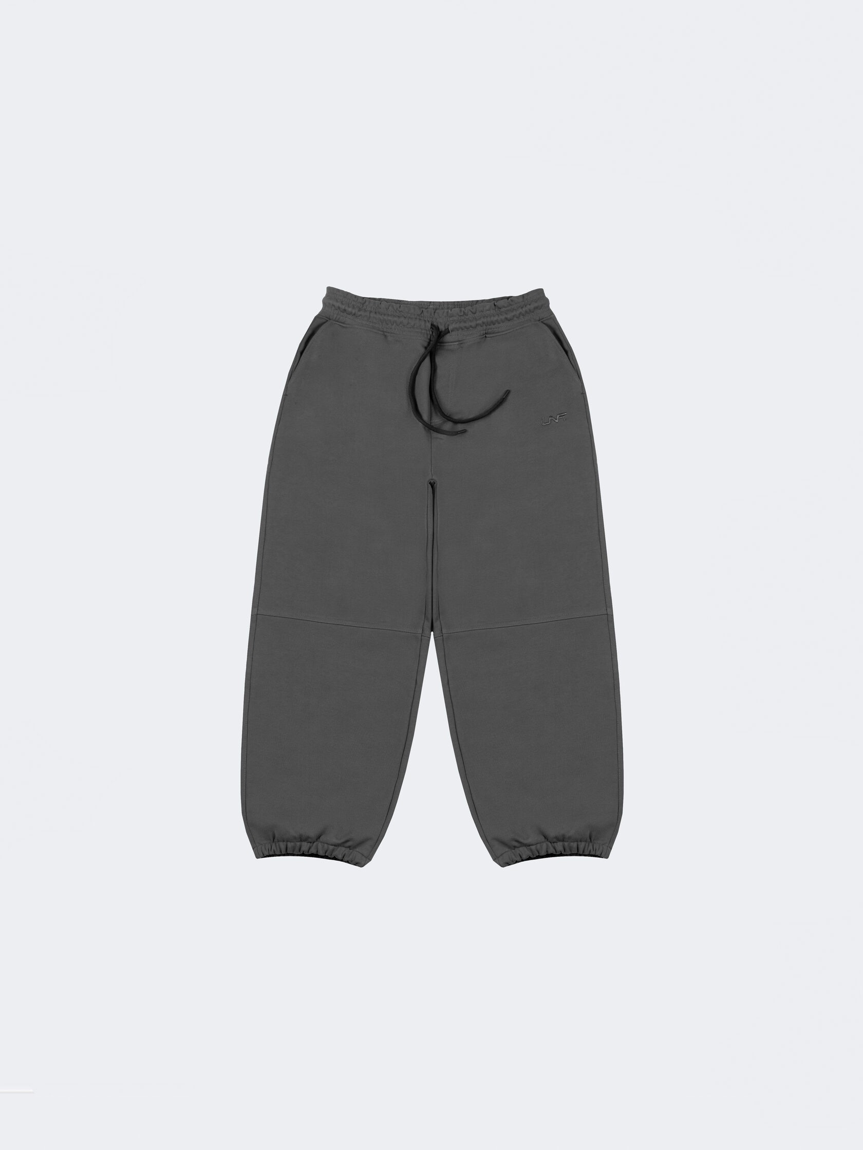 Базовые штаны широкого кроя из плотного хлопка графитового цвета без начеса. Актуальны для любого времени года. Имеют регулирующий шнурок и карман на задней части изделия