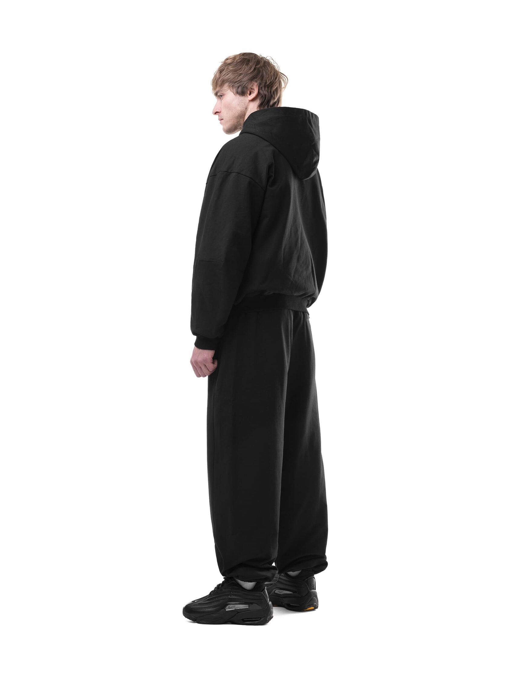 Спортивные штаны свободного кроя выполнены из тяжелого натурального хлопка. Модель дополнена декоративной строчкой по центру штанины — спереди и сзади. По бокам расположены два кармана и один сзади. Пояс на широкой резинке. Эластичная вставка в шаговой области для полной свободы.