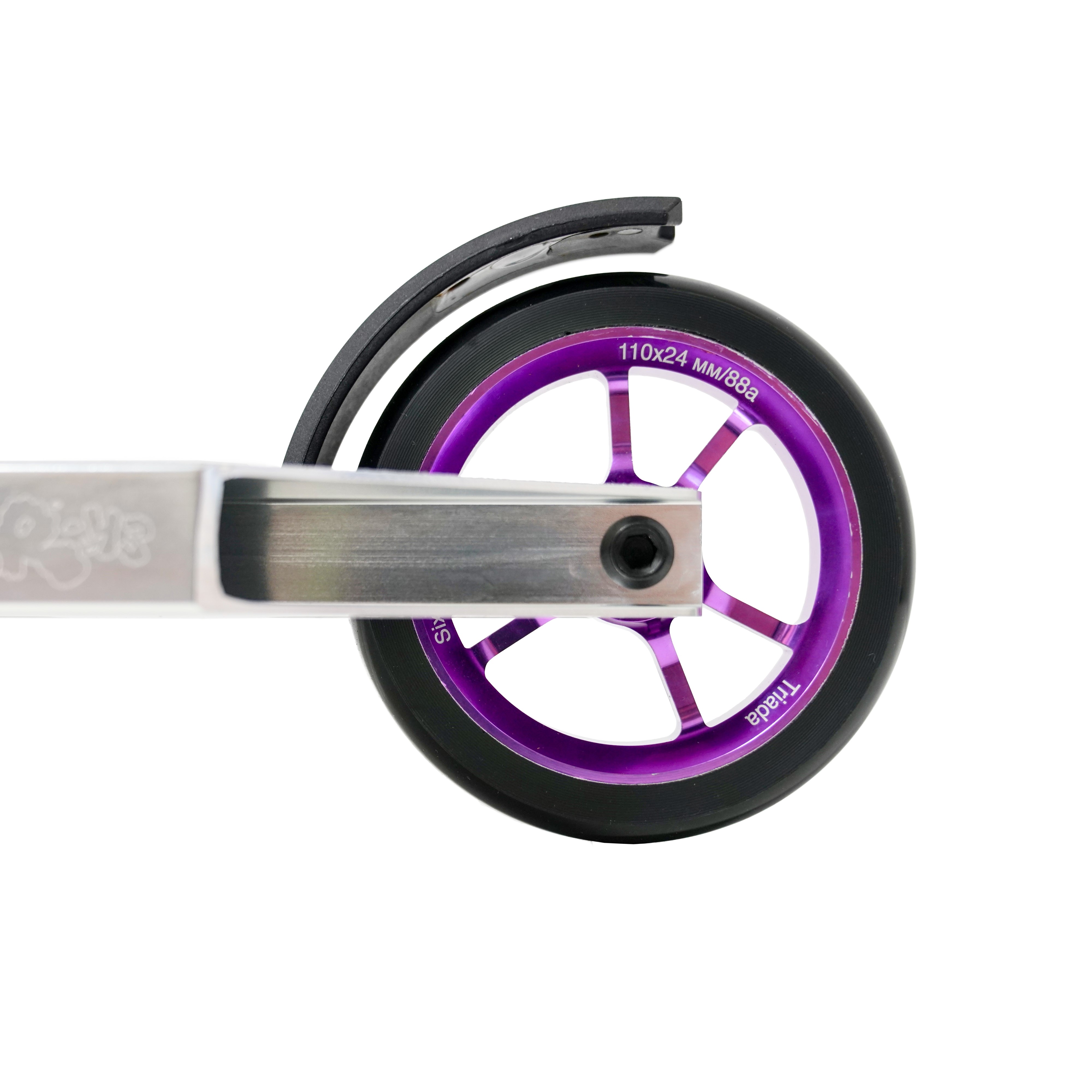 На самокате установлены колеса размером 110Х24 мм ступица алюминиевая, гелик из полиуретана.